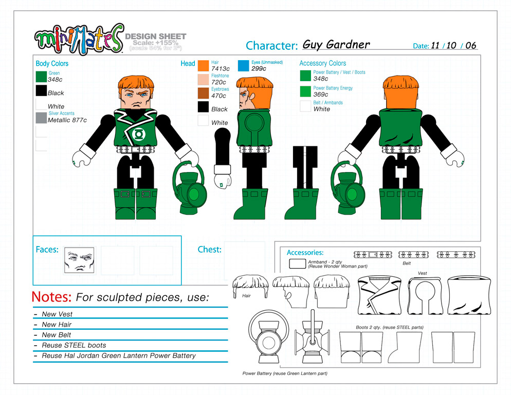 Over the course of 2005-2008, I assisted Art Asylum, designing production control art for various projects, most notably their Minimates line. This involved turnaround views for every part of the figure that was to be included in the final product, along with any surface artwork that needed to be applied.