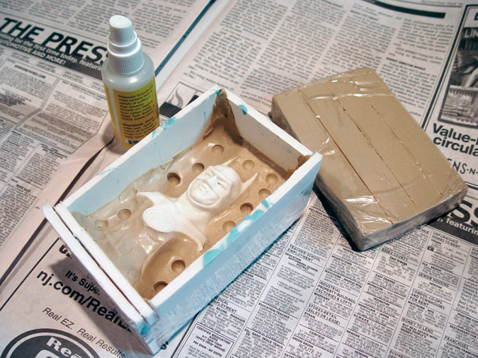 Slice away the seams of the mold box and remove most of the Kleen Klay, leaving only a pour spout. Use Rubbing Alcohol to clean up any residue. Retape the edges of the box and fill any seams along the edge with Kleen Klay. Spray with Mold Release, covering every surface thoroughly. This is absolutely the most important step, as you do not want the silicone bonding with itself! Repeat the molding procedure from step 2. Once this fully cures, you will have a 2-part mold at your service.